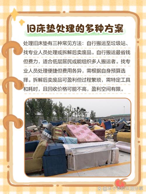 〖Two〗、处理旧床垫有四大实用方法,既能避免浪费又能物尽其用。 回收处理 多数城市提供床垫回收服务,可通过市政回收热线、小区物业或专业回收平台预约。部分家具城在购买新床垫时提供免费旧床垫回收服务,可提前询问商家政策。 二手转卖 若旧床垫完好无污损,可尝试闲鱼、本地二手群或社区闲置群转卖。
