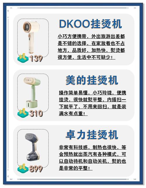 松下NI-GT100参数:额定功率1600W,蒸汽持续30分钟,MAX 10g/min,2档调温。特点:蓄热材料设计,熨衣间隙可加热,适合连续使用。选购总结家庭用户:优先选普通蒸汽挂烫机(双杆或熨板款),兼顾性能与容量。差旅用户:选手持挂烫机,注重便携性与轻量化。