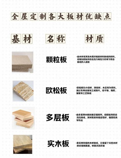 〖Four〗、全屋定制板材有多种,常见的像实木板材、人造板材等,各自优缺点不同。实木板材优点是天然环保、质感温润、坚固耐用,给人高品质家居感受,且纹理美观独一无二。缺点是费用高,易受环境影响变形开裂,保养要求高。人造板材中,刨花板结构均匀,握钉力好,加工性能佳,费用相对亲民,但防潮性一般。