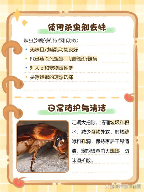 〖One〗、使用洗洁剂或消毒水擦拭:将打死蟑螂的地方用洗洁剂或消毒水仔细擦拭,确保清洁干净,避免留下残余的虫卵或细菌。喷洒杀虫剂:为了彻底消灭可能残留的蟑螂或虫卵,可以在清洁后喷洒适量的杀虫剂。处理打死的蟑螂:开水浸泡:将打死的蟑螂用开水浸泡,这样可以有效杀死可能存在的虫卵和细菌。