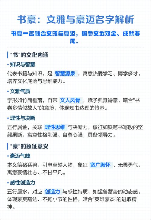 〖Two〗、书豪名字的含义是才华横溢、胸襟宽广、不拘小节。具体来说:才华横溢:“书”在名字中通常寓意着才华、有才气,象征着温文尔雅、学识渊博的特质。它代表着对知识的追求和文化的积淀。胸襟宽广:“豪”在名字中则常用来形容性格豪迈、大气,具有杰出才能的人。