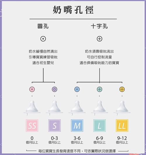 〖Two〗、观察奶嘴孔大小:奶嘴孔有不同形状和大小,圆孔大小不同流量也不同,Y 字形孔和十字形孔适合稍大宝宝,可根据其设计判断型号。 借鉴宝宝年龄:不同年龄段宝宝吸吮能力和食量不同,新生儿通常用最小号奶嘴,随着宝宝长大再更换大一号。