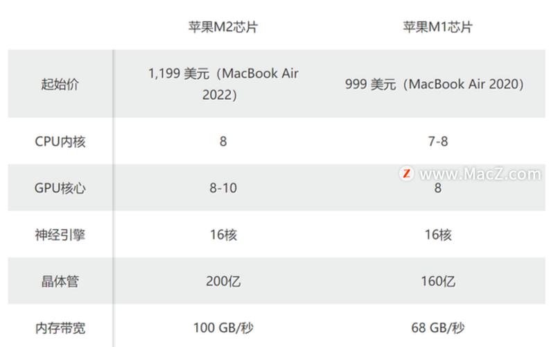 性能提升:M2芯片相比M1,拥有更多的晶体管,数量增加了25%,这使得M2的GPU运算速度提高了35%,整体处理速度更快。内存带宽:M2芯片支持高达100GB/s的内存带宽,而M1的内存带宽较低,这影响了数据传输的速度和效率。