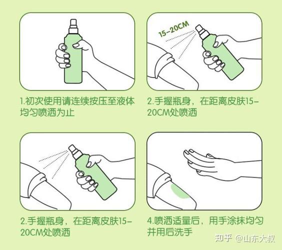 〖One〗、第一,使用部位:可涂抹在皮肤暴露部位,如胳膊、腿部等,但要避开眼、嘴、伤口处。若不慎入眼,要及时用大量清水冲洗。第二,使用方法:可以直接涂抹,也可先喷在手上再涂抹,均匀覆盖皮肤。不过,婴幼儿皮肤娇嫩,建议先喷在大人手上,再涂抹到孩子身上。第三,使用量:适量使用即可,并非越多越好。