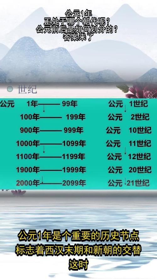 〖Six〗、时间定位:公元1年,也称为公元元年,是公历纪年法的开始,属于公元1世纪0年代。公历纪年法是一种来自西方的纪年方法,它以耶稣诞生作为起点进行计算。中国历史背景:在公元1年,中国正处于西汉时期。汉平帝在这一年登基,并改元为“元始”,因此公元1年也被称为元始元年。