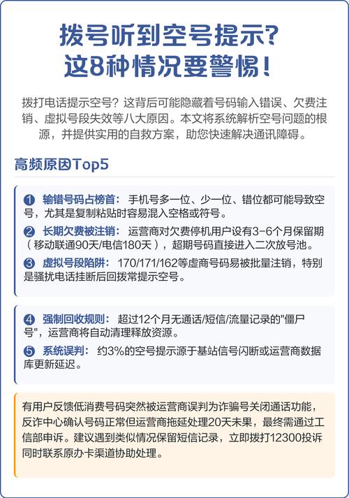 拨打号码突然提示是空号,可能由号码状态异常、操作或设置问题、网络或系统问题、特殊号码类型四类原因导致,具体如下:号码状态异常 欠费停机:当号码余额不足且超过运营商设定的宽限期后,系统会临时冻结号码,导致无法正常接听或拨打,此时会提示空号。需及时充值缴费,等待5~10分钟后重启手机恢复使用。