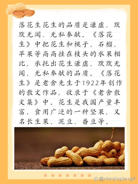 〖Three〗、《落花生》一文揭示了学习花生的不图虚名、默默奉献的品格。具体来说:不图虚名:花生虽然生长在地下,外表平凡无奇,但它却默默地生长,不追求表面的华丽和虚荣。这种品格启示人们,在生活中应该注重内在的价值,而不是过分追求外在的荣誉和名利。