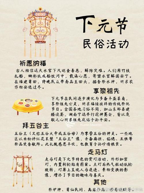 下元节是农历十月十五日,是中国传统节日之一。在这一天,人们有许多风俗习惯,主要包括祭拜祖先、放河灯和祭祀神灵等。首先,下元节是一个重要的祭祀节日。人们在这一天会祭拜祖先,以此表达对逝去亲人的敬意和怀念。祭拜活动通常包括设置祭坛、献上供品等仪式。其次,放河灯是下元节的特色风俗之一。