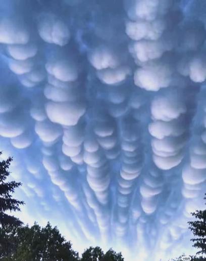 乳状云是强对流天气的预警信号,预示可能有雷暴、冰雹甚至龙卷风出现。这种云看起来像一串悬挂的“乳房”或“气泡”,通常在积雨云下方形成,由下沉冷空气和上升暖湿气流剧烈碰撞导致。夏季常见于雷暴过境前后,且多出现在午后至傍晚。
