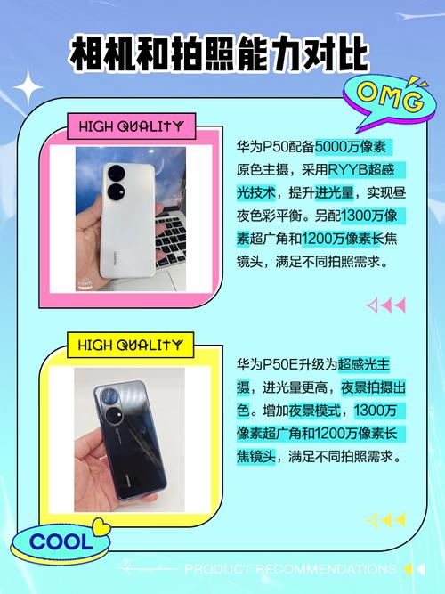 〖Three〗、区别一:处理器性能 华为P50搭载的是更先进的处理器,其性能表现更为出色,在处理和运行大型应用、游戏等方面更为流畅。而P50E的处理器性能相对稍弱。区别二:摄像头配置 华为P50的摄像头配置更为高级,拍照效果更佳,具有更高的像素和更好的拍照功能。