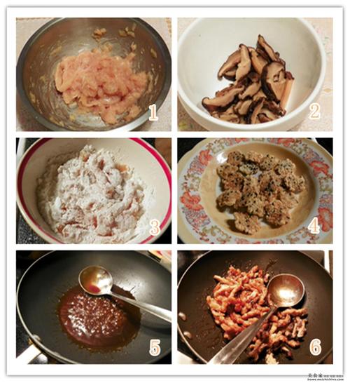 倒入炸过的肉丝和冬菇丝,收小火,快速翻拌均匀,熄火,将肉丝和冬菇丝铺在锅巴上,再淋入锅里的汁,面上铺上葱丝。