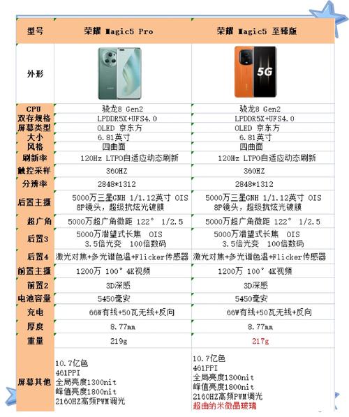荣耀Magic5:搭载高通骁龙8Gen2处理器,配备LPDDR5X内存和UFS1闪存,性能强劲。荣耀Magic5Pro:同样搭载高通骁龙8Gen2处理器,但配备UFS0闪存和独立显示芯片,整体性能表现更胜一筹。其他配置 荣耀Magic5:配备双扬声器、NFC、红外遥控等功能,金属中框提升质感。