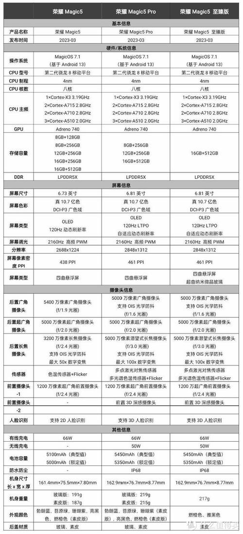 〖Three〗、荣耀Magic5标准版在性价比方面表现出色,适合对3D人脸支付、IP68防水、无线充电等高端功能不是特别需求的用户。荣耀Magic5 Pro版则是当下荣耀用户的首选机型,它集合了高性能、出色屏幕、强大影像系统以及多项特色功能于一身。