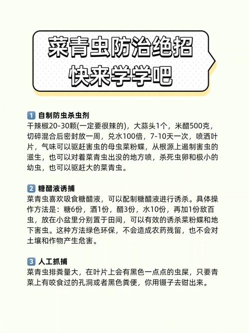 青菜长虫但不想喷农药,可以采取以下几种方法进行处理:合理间作 将青菜与其他具有驱虫效果的植物进行间作种植。这种种植方式可以利用植物间的相互作用,达到自然治虫的效果。例如,有些植物能够释放特定的气味或化学物质,这些物质对某些害虫具有驱赶或杀灭作用。通过合理间作,可以有效减少青菜上的虫害。
