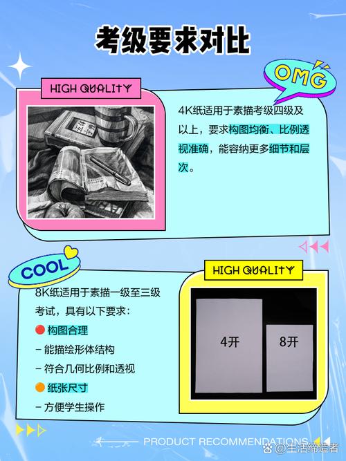 素描纸的大小选取取决于个人的绘画需求、技能水平和经济状况,4k和8k素描纸的主要区别在于尺寸和适用场景。尺寸差异:4k素描纸的常见规格为54cmx38cm或53cmx37cm,而8k素描纸的尺寸为38cmx25cm或37cmx26cm。简而言之,4k纸的面积大约是8k纸的两倍。