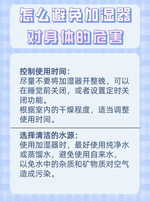 开一晚上,这些有害物质可能会随着水雾散发到空气中,进一步危害健康。另外,加湿器使用的水源若不干净,含有杂质等,也会通过水雾污染空气。而且,如果加湿器摆放位置不当,比如靠近电器,可能会因水汽导致电器受潮,影响其使用寿命甚至引发短路等安全隐患。 湿度问题:室内湿度长时间过高,会给人带来不适感受。