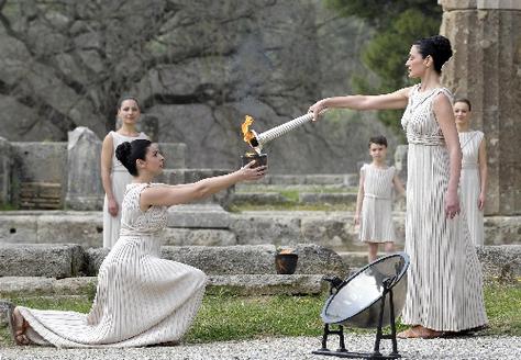 〖Two〗、奥运圣火在希腊奥林匹亚的赫拉神庙采集。奥运会圣火通常于奥运会开幕前几个月在奥运会发源地——希腊奥林匹亚的赫拉神庙前点燃。圣火采集方式遵循古希腊的传统,由首席女祭司在奥林匹亚的赫拉神庙前朗诵致太阳神的颂词,然后通过将太阳光集中在凹面镜的中央,产生高温引燃圣火,这是采集奥林匹克圣火的唯一方式。