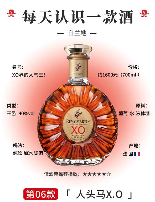 XO既不是红酒也不是白酒,而是白兰地的一种。以下是具体分析:XO的定义:XO是代表顶极的最上乘的白兰地酒。白兰地,是把葡萄酒再加以蒸馏而成的一种烈酒。与红酒的关系:从生产原料上看,XO与红酒更为接近,因为白兰地的原料是葡萄酒。