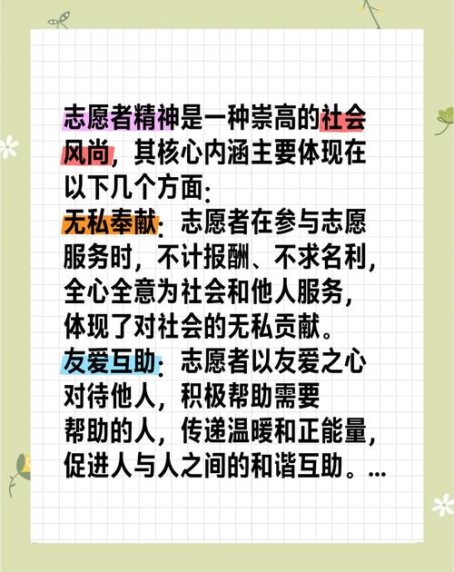 〖Two〗、奉献友爱互助进步是志愿者精神。这一精神内涵丰富,具体包括以下几个方面:奉献精神的体现 奉献精神是志愿者精神的精髓,它强调不求回报地付出。志愿者们在不求名利、不计报酬、不要特权的情况下,积极参与各种志愿服务活动,默默奉献自己的力量。