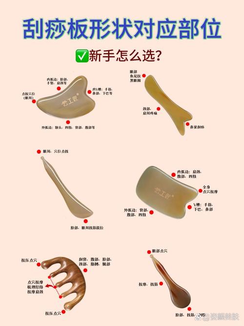 〖One〗、- 四肢和颈部:可以选取三角刮痧板或扇形刮痧板,适用于打通穴位,激活组织细胞,促进血液循环。- 背部:可以选取方骨刮痧板,常用于背部刮痧,可显着调节五脏六腑功能,行气活血,增强免疫功能。 刮痧板的形状选取:- 牛角刮痧板是民间传统中比较好的刮痧板工具,使用的材料有水牛角、黄牛角、牦牛角、羊角等,各有各的功能。