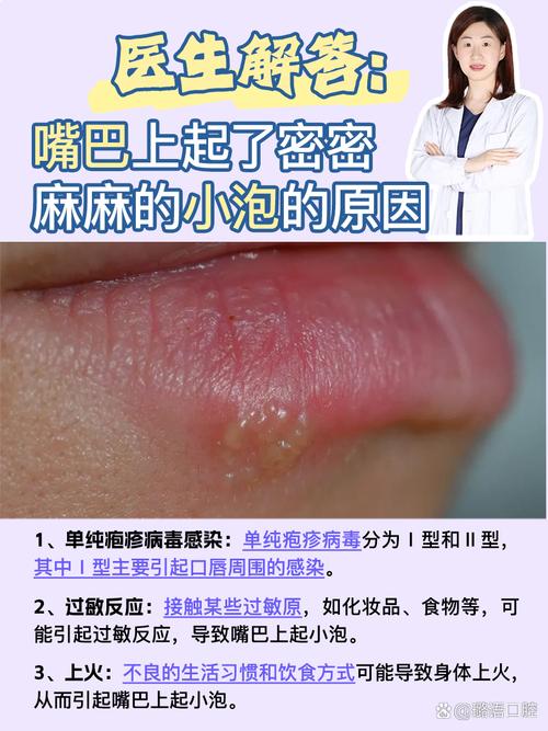 〖Four〗、嘴唇起小水泡通常由以下几种原因引起,需根据具体病因进行针对性处理: 单纯性疱疹病毒感染(唇疱疹)这是最常见的原因,由Ⅰ型单纯疱疹病毒(HSV『1』)感染引发。病毒通过直接接触(如接吻、共用餐具)传播,潜伏于三叉神经节,当免疫力下降(如感冒、疲劳、月经期)时复发。