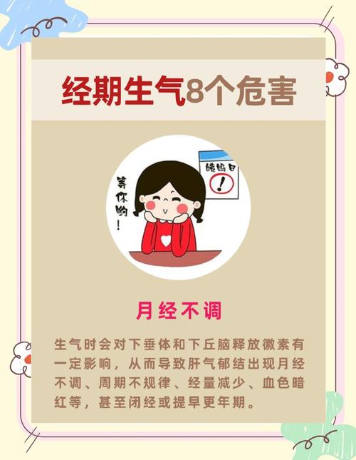 〖Four〗、月经期生气可能引发以下危害:月经失调月经期间,女性体内雌激素和孕激素水平波动较大,情绪波动会进一步干扰下丘脑-垂体-卵巢轴的调节功能。生气时,肾上腺素分泌增加,可能抑制促性腺激素释放,导致月经量减少、经期延迟,甚至闭经。长期情绪波动还可能形成恶性循环,加重内分泌紊乱。