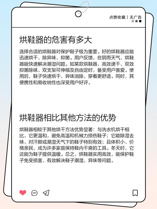 烘鞋器的危害主要有以下两点:对鞋子的损害:烘鞋器使用时间越长,对鞋子的伤害越大。频繁使用烘鞋器会缩短鞋子的寿命,因为长时间高温会影响鞋面的粘合胶,导致其容易开裂。因此,建议减少烘鞋器的使用频率,以保护鞋子的结构完整性。