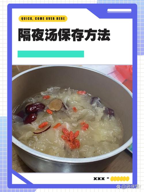 〖Five〗、晚上煲的汤若需隔夜保存,必须放入冰箱冷藏,但需严格遵循以下条件以确保安全:冷藏条件与操作规范温度控制:冷藏环境需保持在4℃以下,此温度可显著抑制细菌繁殖。若冰箱温度不达标,微生物可能快速增殖,导致汤品变质。冷却要求:热汤不可直接放入冰箱,需先冷却至室温(约25℃以下)。