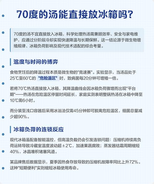 〖Two〗、汤没凉透不建议直接放入冰箱,但并非绝对不可以。以下是对此问题的详细解不建议直接放入冰箱的原因 增加冰箱负担:热汤直接放入冰箱,会使冰箱内的温度升高,为了维持设定的冷藏或冷冻温度,冰箱需要加大制冷功率,从而增加了冰箱的能耗和运行负担。