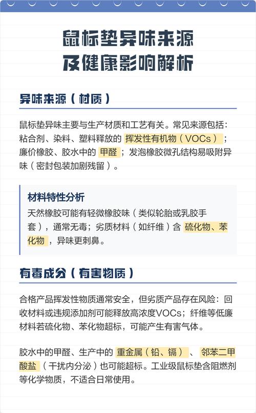 〖Two〗、鼠标垫有味道通常不是甲醛,而是橡胶味道。具体原因如下:成分原因:当下市面上大部分的鼠标垫都是由天然橡胶加布面所制成的,因此新购买的鼠标垫往往会带有橡胶的味道。甲醛特性:甲醛通常具有强烈的刺激性气味,并且对人体有害。然而,鼠标垫的橡胶味道虽然可能令人不适,但并不等同于甲醛。