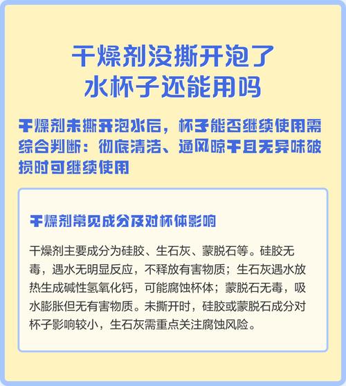 干燥剂未撕开而与水接触后,虽然通常不会对人体造成直接危害,但杯子是否可以继续使用取决于干燥剂的类型。如果杯子中使用的是无毒的干燥剂(如硅胶),且已完全浸泡在水中,那么杯子可以清洗后继续使用。然而,若是生石灰等化学干燥剂与水接触,可能会产生热量,长时间接触可能会对人体造成伤害。