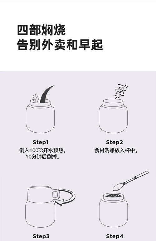 焖烧壶的使用方法如下:预热焖烧壶 在使用焖烧壶之前,首先要对其进行预热。准备一个干净的焖烧壶,倒入半杯烧开的水,然后迅速盖上盖子。等待大约20到30秒后,将壶中的热水倒掉。这一步的目的是为了预热焖烧壶,使其内部温度上升,有利于后续食材的焖烧。准备食材 下面,准备要焖烧的食材。