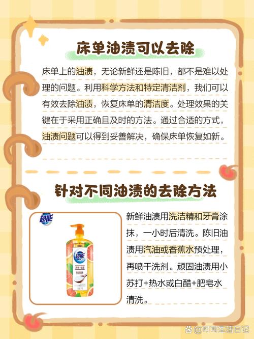 〖Five〗、对于刚沾上不久的小面积油渍:洗洁精是最方便的选取。先用纸巾吸干表面油渍,然后涂抹洗洁精静置10分钟,轻轻刷洗就能去除。如果是彩色床单,配合湿巾反复擦拭效果会更好。普通油渍:可以用小苏打加洗衣液的组合。在油渍处撒上小苏打粉,静置20分钟后用软毛刷轻刷,最后清水冲洗即可。