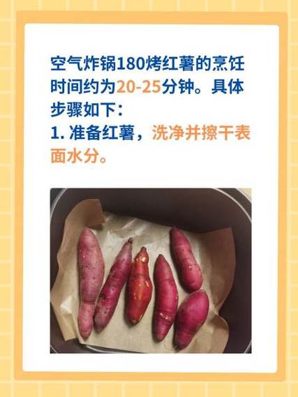 〖Two〗、空气炸锅180烤红薯需20『2』5分钟。 预热炸锅至180℃,放入红薯,间隔一定距离。 设定烹饪时间20『2』5分钟,期间翻动1『2』次。 熟透后关火,稍等几分钟即可享用。