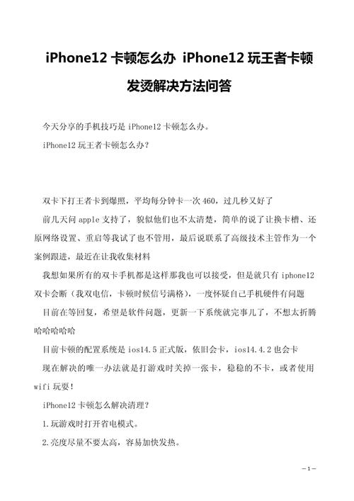 〖Five〗、iPhone 12在运行王者荣耀时遇到卡顿,无需担忧,这里有一系列实用的解决方案。首先,确保手机内存充足。关闭不必要的后台应用、清理缓存和临时文件,甚至卸载不常用的应用,都能有效释放内存空间,缓解卡顿现象。其次,优化应用资源管理。