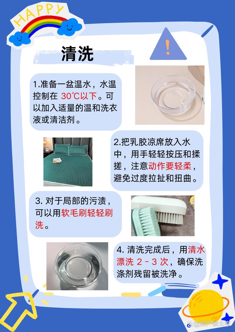 〖Six〗、步骤:将乳胶凉席放入大盆中,加入适量清水或温水。然后用手摩擦、反复挤压多次将污渍洗去。大约清洗3—5分钟左右。然后清洗后再过三遍清水,用手轻轻的挤干水分。最后放在通风但是不被阳光直射的地方风干即可。