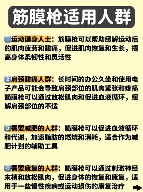 〖Four〗、关于筋膜枪是否能减肥,答案是否定的。筋膜枪主要用于缓解肌肉及筋膜的紧张,没有直接减肥效果。若要达到减肥目的,还需结合长期的运动和合理的饮食控制。不过,在运动后使用筋膜枪可以帮助排出体内堆积的乳酸,减轻肌肉酸痛感,从而辅助减肥过程。