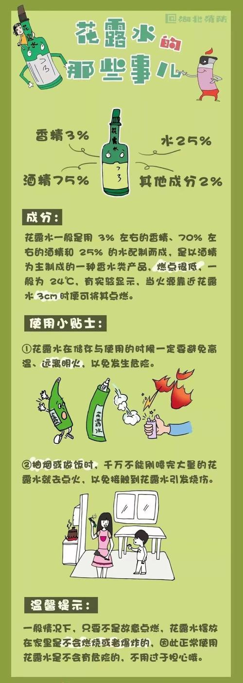 〖Two〗、花露水中还含有75%的酒精和5%的香精是可以燃烧的,所以说主要燃烧的是酒精,少量的柠檬酸钠会溶解在剩下的蒸馏水中,是无毒的,对人体无害的。可以对花露水进行加热,因为花露水的主要成分为酒精(做溶剂用的),酒精易挥发。