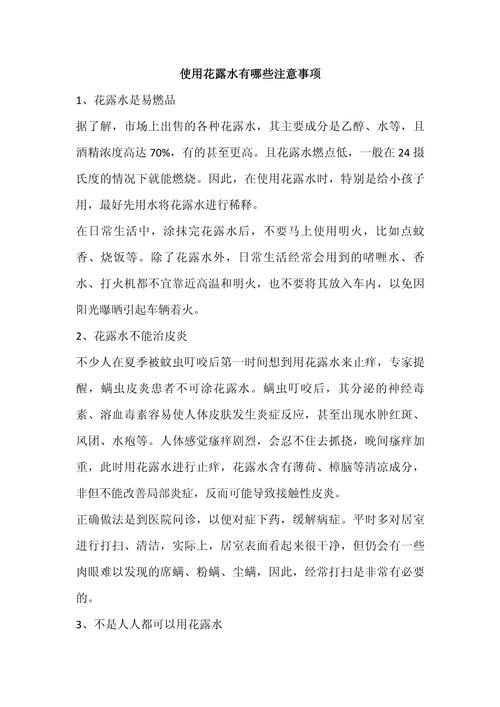 〖Three〗、花露水具有驱蚊和止痒的效果,但在使用时有一些注意事项需要遵守,以确保正确使用并安全。 花露水含有酒精成分,因此使用时应远离火源,以防发生火灾。应将花露水存放在儿童无法触及且远离火源的地方。 如果皮肤有炎症或发炎,应停止使用花露水。