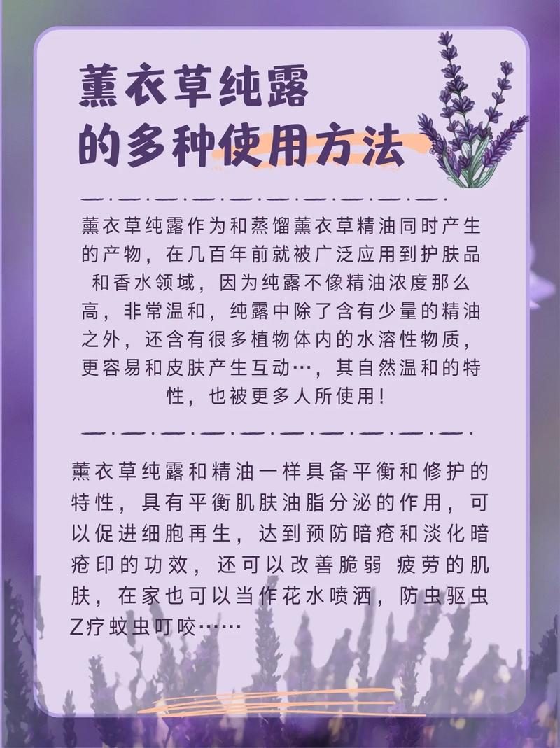 〖Five〗、长期使用纯露是有益的,因为它天然温和,不含刺激性成分如香精和酒精,大部分肤质的人群,只要不对花粉过敏,都可以尝试。纯露的使用方法多样,可作为爽肤水使用,舒缓肌肤,补充水分;甚至可以用于护发,洗发后喷洒在头发上,能增强头发的光泽和柔顺度。