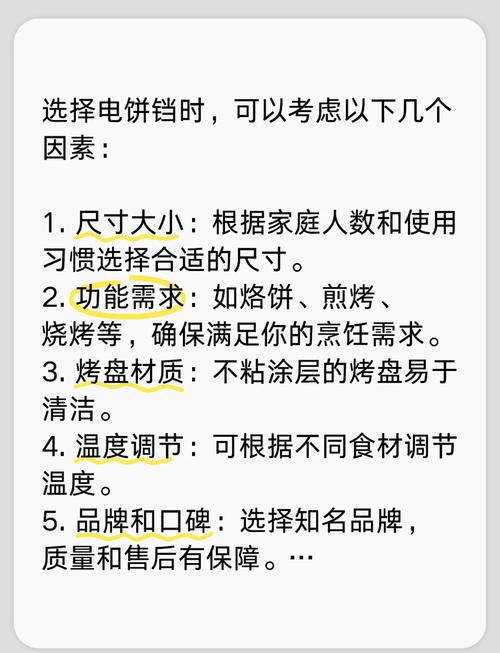 〖One〗、其次,注意电饼铛的使用环境。电饼铛应放置在干燥通风的环境中,远离易燃易爆物品,避免在潮湿或有可能喷洒液体油脂的地方使用。此外,还应避免长时间空烧,连续工作时间不宜超过24小时,以防止超负荷工作对电饼铛造成损害。再者,正确的使用方式也是保养电饼铛的关键。