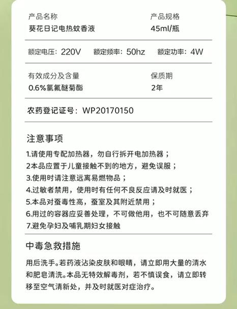 明确需求 选购电蚊香液前,首先要明确自己的需求,比如使用场景、使用时长以及是否需要考虑成分安全性。选取知名品牌 建议选取知名品牌的电蚊香液,这些品牌的产品通常质量更有保障,且经过了相关安全认证。可以通过网络或实体店的评价来了解哪些品牌口碑较好。