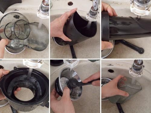 榨汁机怎么清洗 清水清洗 榨汁机由于里面的结构比较复杂,有刀片还有容器等等,所以当榨完汁之后,如果直接用抹布去清洗,很多角落的地方并不能够清洗完成。可以教大家一个非常简单的方法,就是在榨汁机当中再加上一罐清水,然后盖上盖子,按动按钮,让机器再继续工作一下。
