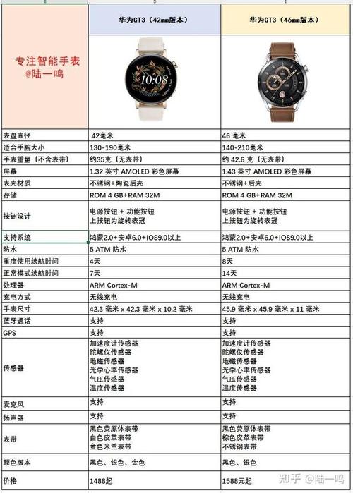 华为GT3的参数配置详细如下:华为GT3有两种尺寸可选,分别为46mm和42mm。其中,46mm版本的屏幕尺寸为43英寸,分辨率为466466像素,采用了AMOLED显示技术。该版本的手表搭载了ARM Cortex-M处理器,并配备了455mAh的电池,支持无线充电和反向充电,典型使用场景下续航时间可达14天。