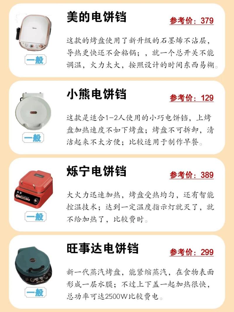 〖Two〗、w的电饼铛更为合适;而如果您只需要满足日常需求,1200w的电饼铛则是更好的选取。在选取电饼铛时,还需考虑加热均匀度、耗电量、费用等因素。最后提醒大家,在购买和使用电饼铛时要注意安全用电。