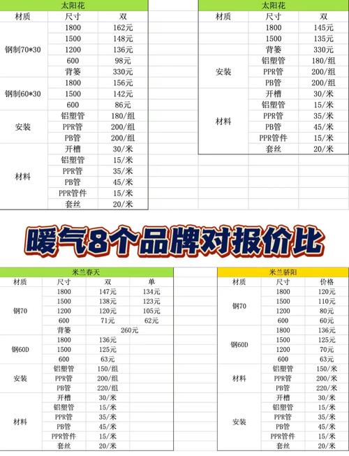 〖Four〗、如果选用铜铝复合暖气片,尺寸为75*75系列,高度同样为1800毫米,那么所需的暖气片片数会有所不同,整体费用可能会上升到9000元左右。对于200平方米的户型而言,安装暖气片的费用大致在6500到7500元之间,具体费用会因暖气片的材质、品牌及安装细节等因素而有所不同。