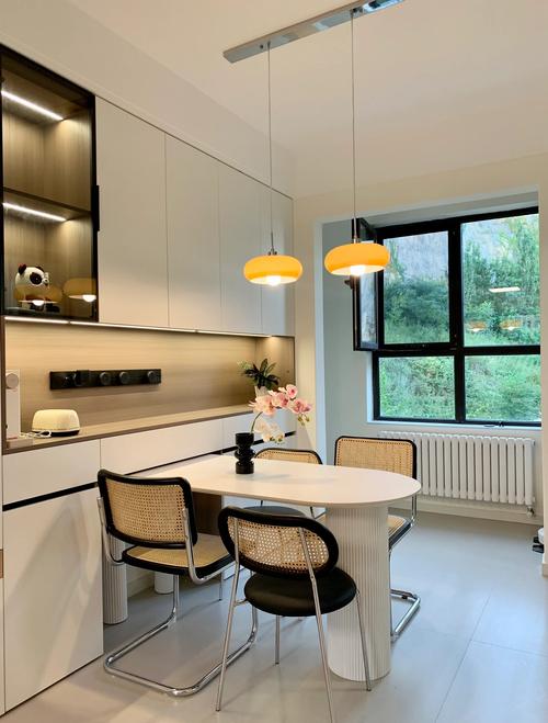窗户下的餐边柜:卡座布局在窗户下方,保留动线,利用窗户满足餐边柜功能,既美观又实用。靠窗布局水吧台,高柜满足电器镶嵌,增强餐厅动线。过道餐边柜:利用过道空间,满足收纳需求,弥补厨房收纳不足。与电视柜联动,增加收纳,实现功能延伸。过道空间满足餐边柜收纳,兼顾餐厅和学习办公。