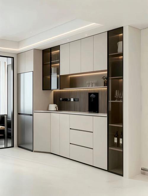 〖Four〗、小型电器:如壁挂式饮水机、微波炉、电饭煲、烤箱等小型厨房电器,若厨房空间有限,可放置在餐边柜的开放式隔层中。 精美摆件:精心设计餐边柜,可以增添居室美感。在开放式隔层中摆放绿植、装饰摆件或有序地放置酒具,都能为餐厅增添一抹亮色。
