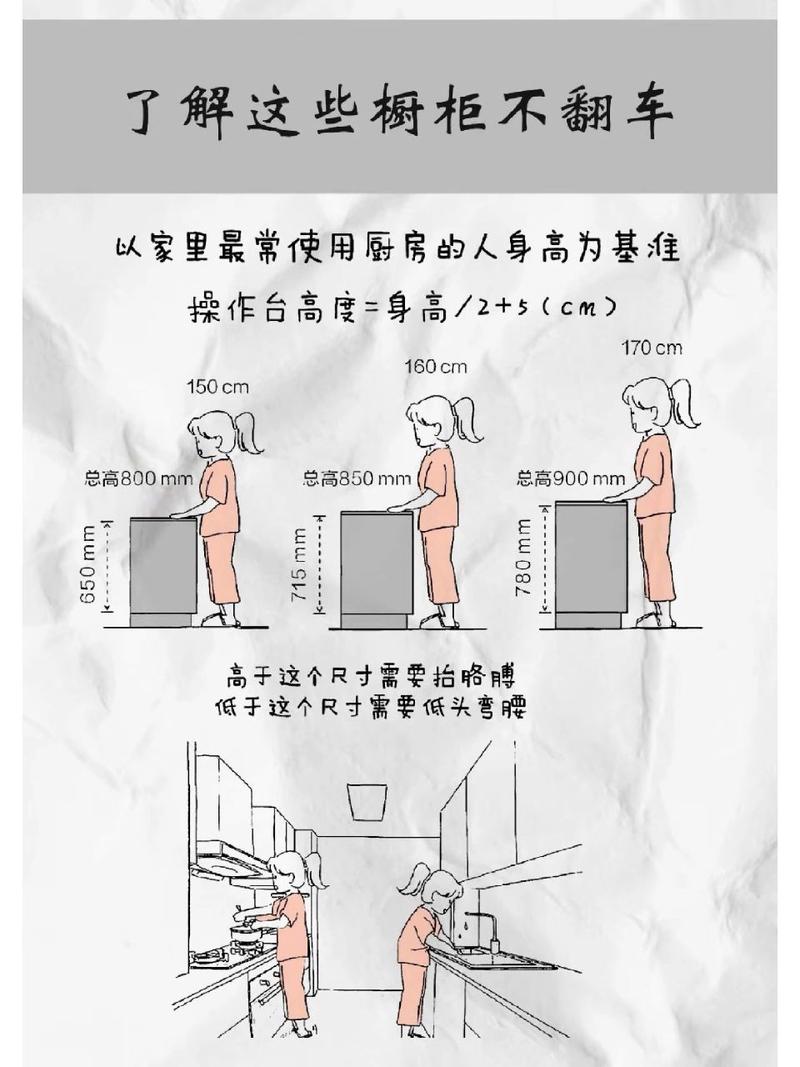 〖Two〗、合适的橱柜高度可以通过以下公式来计算:舒适的橱柜高度=使用者身高/2+cm。个性化调整:由于家庭成员身高可能不同,橱柜高度可以适当偏高或者偏低一些,以适应不同使用者的需求。一般标准:通常,如果使用者身高在165cm以下,橱柜高度建议选取80cm左右;若身高在165cm以上,橱柜高度则建议选取85cm左右。