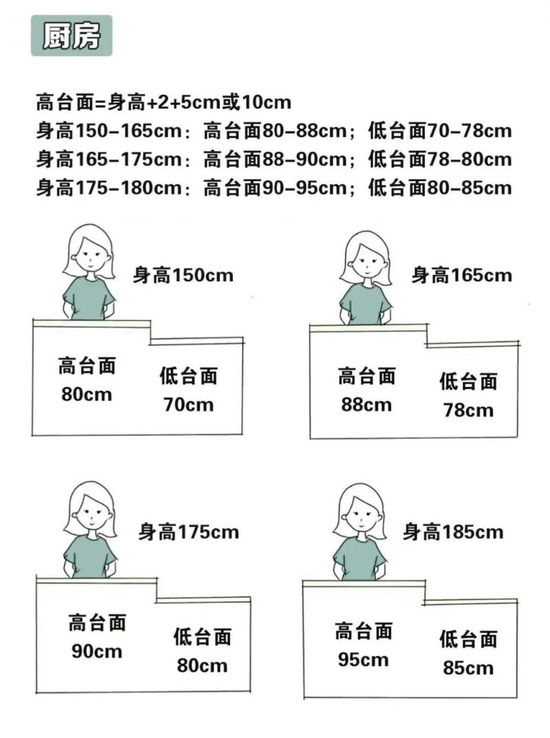 橱柜高度与身高对照表如下:身高150~155厘米:橱柜高度建议为80到88厘米。这个高度范围是根据身高除以2后,再加上5~10厘米得出的。身高160~165厘米:橱柜高度建议为85~95厘米。同样,这个范围也是基于身高与一定加值的计算得出的。身高165~170厘米:橱柜高度建议在90~95厘米之间。